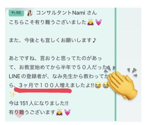 LINE47名→3ヶ月で151名!講座説明会に20名集客成功!成約7名満員御礼追加募集はたった30分で満席になるという、